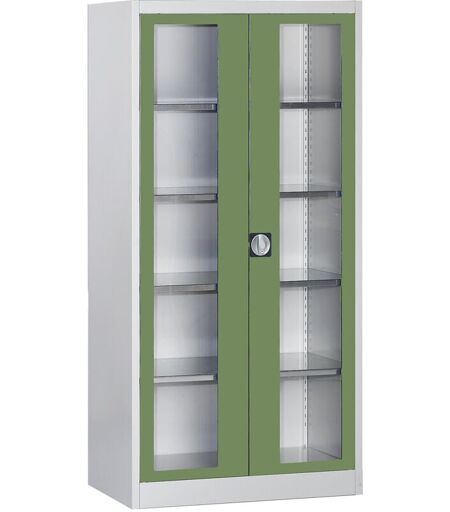 Armoire vitrée à portes battantes, avec 4 tablettes, h x l 1950 x 950 mm, profondeur 420 mm, gris clair / vert réséda. Produit livré = monté. Hauteur = 1950 mm. Largeur = 950 mm. Profondeur = 420 mm. Type de porte = porte battante. Modèle de porte = avec vitre. Coloris corps = gris clair RAL 7035. Coloris porte = vert réséda RAL 6011. Nombre de tablettes = 4 pces. Charge max. par tablette = 50 kg. Réglage en hauteur des tablettes = 35 mm. Verrouillage = serrure à cylindre interchangeable et jeu de 2 clés. Verrou = 3 points. Matériau tablettes = tôle d'acier, galvanisée. Matériau du corps = tôle d'acier. Matériau porte = tôle d'acier. Surface = peint époxy. Armoires à visibilité: contenu toujours visible, accès rapide sans nécessité de chercher longtemps l'article désiré. Avec tablettes galvanisées réglables en hauteur. Construction robuste en acier soudé - immédiatement prête à l'emploi. Vitres en plexiglas résistant aux chocs. Corps et portes battantes en tôle d'acier robuste et ...