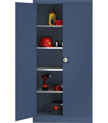Armoire de stockage, h x l x p 1950 x 950 x 420 mm, bleu. Produit livré = monté. Hauteur = 1950 mm. Largeur = 950 mm. Profondeur = 420 mm. Type de porte = porte battante. Coloris corps = bleu brillant RAL 5007. Coloris porte = bleu brillant RAL 5007. Nombre de tablettes = 4 pces. Charge max. par tablette = 80 kg. Réglage en hauteur des tablettes = 35 mm. Verrouillage = verrouillage trois points par serrure de sécurité à cylindre interchangeable. Verrou = 3 points. Coloris tablettes = galvanisé. Matériau tablettes = tôle d'acier, galvanisée. Matériau du corps = tôle d'acier. Matériau porte = tôle d'acier. Surface = peint époxy. Largeur tablettes = 1195 mm. Utilisation optimale de l'espace de rangement. De nombreux coloris pour votre atelier, votre entrepôt et votre entreprise. Armoires métalliques robustes, peinture cuite au four. En standard, avec quatre tablettes. Portes renforcées Résistantes à la torsion, montées sur pivots en acier. Verrouillage trois points par serrure à cylindre ...