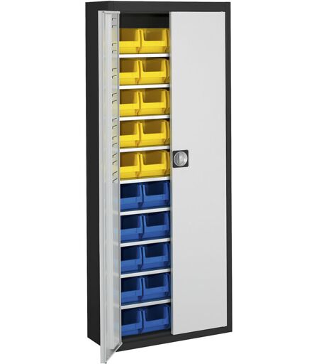 Armoire à outillage avec bacs à bec, h x l x p 1740 x 680 x 280 mm, bicolore, corps noir, portes grises, 40 bacs. Produit livré = monté. Hauteur = 1740 mm. Largeur = 680 mm. Profondeur = 280 mm. Type de porte = porte battante. Verrouillage = verrouillage trois points par serrure de sécurité à cylindre interchangeable. Angle d'ouverture des portes = 135 °. Nombre de tablettes = 9 pces. Nombre de bacs / L x l x h = 20 bleus / 230x150x130 mm, 20 jaunes / 230x150x130 mm. Nombre de bacs = 40 pces. Charge max. par tablette = 50 kg. Coloris corps = noir graphite RAL 9011. Coloris porte = gris clair RAL 7035. Surface = peint époxy. Matériau = tôle d'acier, polyéthylène. Matériau tablettes = tôle d'acier, galvanisée. Réglage en hauteur des tablettes = 17.5 mm. Charge max. totale = 250 kg. Poids = 61 kg. Pour ranger outils et petites pièces dans l'atelier, l'entrepôt etc. Utilisation optimale du volume de rangement. Modèle simple ou double face. Corps Construction en tôle d'acier soudée, ...