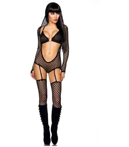 L'Ensemble Body en Résille de la marque de lingerie Saresia est la tenue parfaite pour être ultra sexy pour pouvoir jouer avec votre partenaire comme il se doit ! Votre ensemble est composé de: * Un body noir à capuche en résille ouvert sur l'avant et laissant apparaître votre belle poitrine. * Un soutien-gorge noir accessorisé d'un anneau argenté ainsi qu'un petit bijou long qui descend au niveau du nombril. * Des bas résilles. L'ensemble donne une allure très érotique qui vas vous transformer en une redoutable dominatrice ! Autrement dit, elle sera parfaite pour vos soirées BDSM ! Lavable en machine. Tailles XS, S, M et L. ...