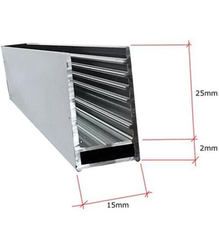 " Profilé mural Alu-U - profilé avec joint de raccordement et embout pour la fixation de vitres fixes 8-10 mm. Le système simple pour le vitrage et pour un maintien sûr. Montage rapide sans temps d'attente. Le vinyle transparent sécurise le verre dans le profilé en aluminium et élimine le besoin de silicone. ... pas de bavure du silicone ... aucun résidu de silicone difficile à éliminer ... le vitrage sec sans silicone pour un maintien sûr de la vitre. ... la vitre peut être retirée ou remplacée à tout moment ... la vitre tient immédiatement en place sans avoir à attendre qu'elle sèche. ...pour une construction réversible et durable Processus de travail : 1. Montage du profilé en U sur le mur de montage 2. Injecter du silicone 3. Insertion de la vitre 4. Application de l'embout Longueur : 2000 mm Largeur : 15mm Profondeur : environ 27 mm pour une épaisseur de verre : 8 mm ou 10 mm, avec du verre de 8 mm, vous devez travailler avec du silicone. Surface : anodisée (Shimmering ) " ...