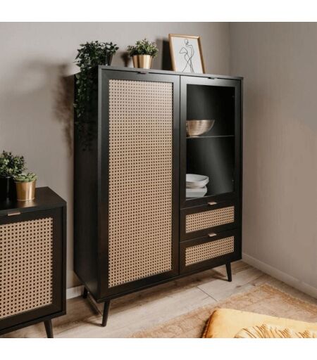 CALICOSY Vitrine Vienna53A 2 portes et 2 tiroirs noir avec façades effet tressage