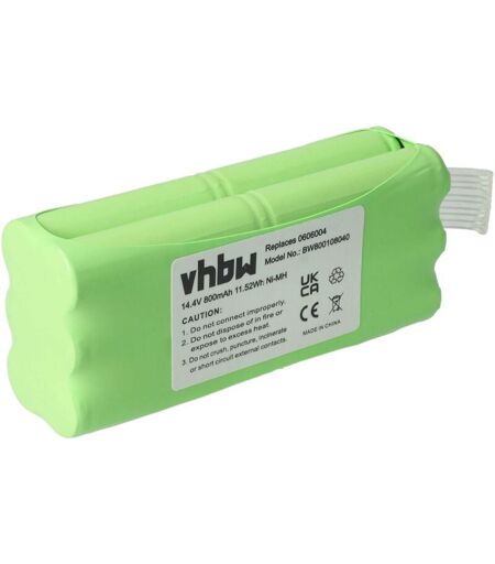 vhbw - the clever way - Batterie de rechange de haute qualité et compatible avec une grande autonomie et compatible avec votre aspirateur robot ou aspirateur robot ainsi qu'appareil de nettoyage (vous trouverez ci-dessous tous les modèles correspondants) - La batterie peut être chargée avec le chargeur standard ou un chargeur compatible - Nos batteries répondent à toutes les normes de sécurité actuelles Pour répandre une odeur fraîche avec votre robot aspirateur ou votre aspirateur, vous pouvez consulter nos offres de cartouches de parfum. CONTENU DE LIVRAISON : - 1x batterie DONNÉES TECHNIQUES : - Technologie : NiMH - Capacité : 800 mAh - Tension : 14,4 V - Énergie nominale : 11,52 Wh - Nombre de cellules : 12 - Poids : 191 g COMPATIBLE AVEC Dirt Devil Libero M606, Fusion M611, Puck M610, M610-1 Pour garantir la compatibilité, veuillez vérifier si votre batterie utilisée actuellement est répertoriée. REMPLACEMENT POUR : - R1-L051B, 0606004, 0607004, 0610014, 0611004, 0612014, ...
