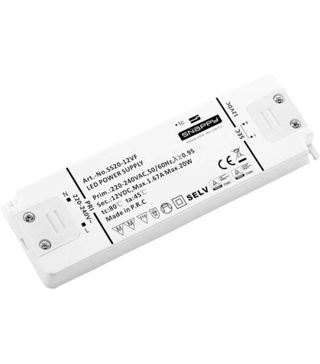 Informations techniques Tension constanteProtection contre les courts-circuits, la surchauffe et la surchargeBoîtier en plastiqe conforme à IP20EN 61347 EN 61000-3-2 CLASSE CFaible hauteur de seulement 14 mm Informations techniques Certificats : MM, SELV, , GS Classe de protection : IP20 Connexion (composants) : borne à vis Couleur : blanc Courant de sortie (max.) : 1.67 A Dimensions produit, hauteur : 15 mm Dimensions produit, largeur : 50 mm Données techniques complémentaires : Tension constanteProtection contre les courts-circuits, la surchauffe et la surchargeBoîtier en plastiqe conforme à IP20EN 61347 , EN 61000-3-2 CLASSE CFaible hauteur de seulement 14 mm Indice de protection : IP20 Longueur : 155 mm Modèle (général) : Alimentation à découpage Modèle de driver LED : à tension constante Nbr. de sorties : 1 x Nombre d'entrées : 1 x Poids : 85 g Puissance (max.) : 20 W Spécificités pour commande de LED : homologué pour les meubles, protection contre les surcharges, surtention ...