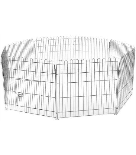 Nos enclos extérieurs en métal sont idéaux pour permettre aux petits animaux de courir dans la nature pendant les beaux jours. L' abri extérieur peut être monté et démonté en quelques étapes simples grâce au système d' enfichage. Il suffit de brancher les différents éléments de la grille et les bielles pour que la piste de vos petits chéris soit prête. La porte permet de faire entrer et sortir facilement les petits rongeurs. Cette clôture pour parc d' enfant est idéale pour les petits animaux tels que les cochons d' Inde, les lapins et les lièvres. La livraison ne comprend pas de filet ! Spécifications Techniques: Enclos extérieur 6 coins Taille par élément (LxH) environ : 60 x 63 cm Diamètre de la circonférence : 120 cm environ Dimensions de la porte (LxH) environ : 31,5 x 48 cm Espacement des grilles : 3 cm environ Enclos extérieur à 8 angles Taille par élément (LxH) environ : 80 x 75 cm Diamètre du périmètre : 210 cm environ Dimensions de la porte (LxH) environ : 32,5 x 42 cm ...
