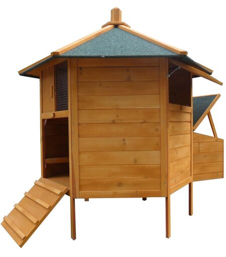 Pavillon de poulailler à 6 coins avec rampe + porte Ce poulailler élégant et surtout bien pensé offre à vos poulets une habitation adaptée à leur espèce, avec des possibilités de retraite appropriées et la liberté de mouvement nécessaire. Le nichoir latéral peut être ouvert vers le haut pour retirer les œufs frais sans trop d'effort. En séparant les nichoirs du reste de la grange, ils restent propres et permettent aux poulets de pondre sans être dérangés. À l'avant du poulailler, il y a une entrée verrouillable pour les poulets et une rampe par laquelle les poulets entrent en plein air. Les animaux sont protégés du froid et de l'humidité par la distance prévue entre le sol et le plancher du poulailler. La construction stable du toit en bois et la couverture imperméable supplémentaire offrent à vos poulets une protection sûre contre la pluie, la grêle et la neige et assurent une longue vie au poulailler. Description de l'article : Matériau : Bois Coloris : naturel/brun Dimensions de la ...