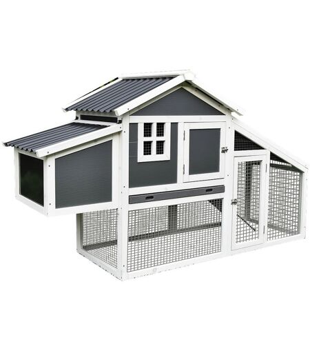 Description générale Bienvenue dans le monde des poulaillers avec notre modèle XXL de 2020, conçu pour offrir un abri idéal à vos poules domestiques, pondeuses ou d'ornement. Ce poulailler spacieux et confortable permet à vos poules de pondre en toute sérénité et de se reposer la nuit sur un perchoir adéquat. Fabriqué à partir de matériaux de qualité supérieure, il est à la fois durable, résistant aux intempéries et respectueux de l'environnement, tout en étant facile à monter et à entretenir. Spécifications techniques Matériau : bois, fil métallique et tôle de zinc Couleur : blanc/gris Dimensions : longueur env. 176 cm (avec boîtes de ponte), hauteur env. 102 cm, profondeur y compris l'enclos env. 66 cm Résistant aux intempéries grâce à son imprégnation Boîte à nid accessible de l'extérieur avec fixation du couvercle incluse Entrées frontale et latérale incluses Tiroir amovible en tôle de zinc pour un nettoyage facile Rampe en bois incluse Grande fenêtre pour une bonne circulation de ...