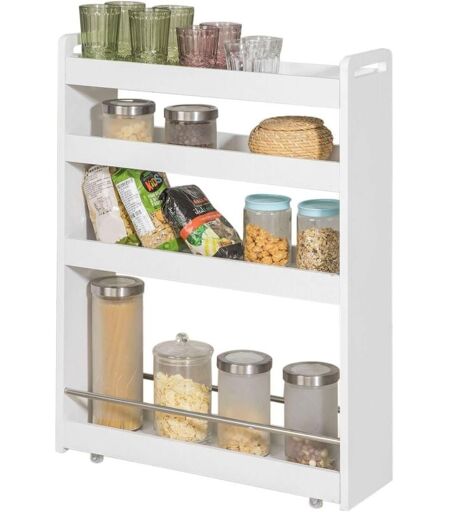 Description générale Ce chariot de niche en bois avec roulettes est idéal pour optimiser l'espace dans les coins étroits de votre maison. Avec un design élégant et pratique, il offre quatre étagères solides pour ranger vos ustensiles, vaisselle ou autres articles essentiels. Il convient aussi bien à la cuisine qu'à la salle de bains ou à la salle à manger, se fondant parfaitement dans votre décor tout en étant fonctionnel. Spécifications techniques Matériau : bois MDF avec finition blanche et tube en acier inox Dimensions : L60 x P18 x H82 cm Poids maximum supporté : 20 kg (5 kg par étage) Poids de l’envoi : 9,5 kg Compatibilité et accessoires Convient pour une utilisation dans des espaces restreints tels que cuisines, salles à manger et salles de bains Accessoires inclus : instructions de montage Installation Montage facile et rapide avec les instructions fournies Utilisation Idéal pour le rangement d'ustensiles de cuisine, de produits de nettoyage ou d'autres articles divers Facile ...