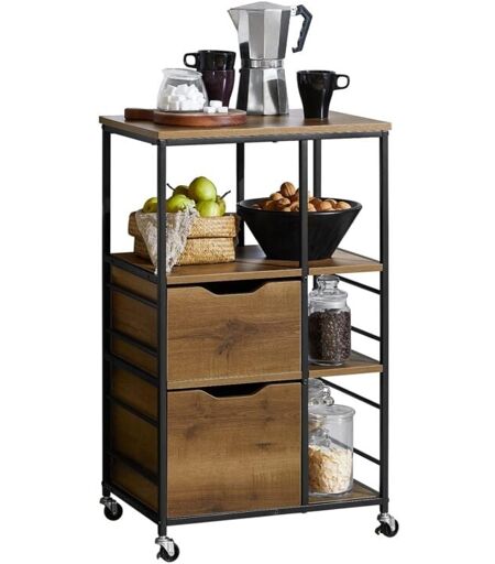 Description générale Idéal pour divers ustensiles dans la cuisine, la salle à manger, au restaurant ou partout où un espace de rangement supplémentaire est nécessaire. Parfait pour les fêtes de famille, ce meuble offre un grand espace de rangement tout en économisant de l'espace au sol. Il convient pour stocker des objets quotidiens tels que des pots, des casseroles, des vases ou des chandeliers. Équipé de 2 grands tiroirs et de 3 étagères, il est également doté de 4 roulettes pour un déplacement facile, dont deux avec frein, permettant de le déplacer aisément où vous le souhaitez. Facile à nettoyer et à entretenir. Spécifications techniques Matériaux : panneaux de particules classe E1 et métal Dimensions (LxHxP) : 53 x 37 x 89 cm Capacité de charge : jusqu'à 60 kg Livré en kit à monter soi-même Notice de montage illustrée et pièces numérotées incluses Compatibilité et accessoires Compatible avec divers ustensiles de cuisine Accessoires non inclus : éléments décoratifs Installation Le ...