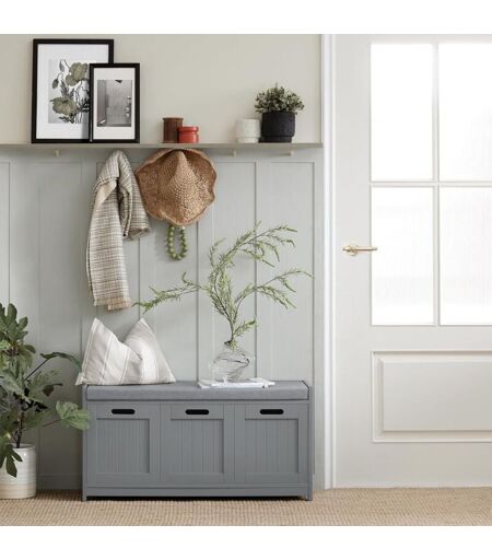 Description générale Ce banc à chaussures élégant est idéal pour votre appartement ou votre maison. Il s'intègre parfaitement dans des espaces tels que l'entrée, la chambre ou le séjour. Avec ses deux portes et un panier amovible facilement transportable grâce à son trou de poignée, il offre un grand espace de rangement pour vos chaussures, écharpes, jouets d’enfant, et plus encore. Son coussin rembourré assure un confort optimal lors de l'enfilage ou du retrait des chaussures, tandis que ses tapis protecteurs anti-dérapants protègent votre sol des rayures. Spécifications techniques Matériau : Bois MDF de classe E1, peint en gris clair, avec coussin en polyester et éponge Dimensions du produit (Lxlxh) : 90x35x45 cm Dimensions du cube : 29x31x32 cm Capacité maximale : Banc : 120 kg, Cube : 15 kg Dimensions de l’emballage : 96x42x17 cm Poids de l'envoi : 18,4 kg Compatibilité et accessoires Cet article est livré sans éléments décoratifs supplémentaires. Il est à monter soi-même, et ...
