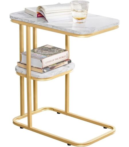 Sobuy - Table d'Appoint Bout de Canapé, Effet Marbre + Structure Métal Doré, 2 Étagères Rangement, Multi‑usage Salon/Chambre/Bureau, L50×P30×H58 cm
