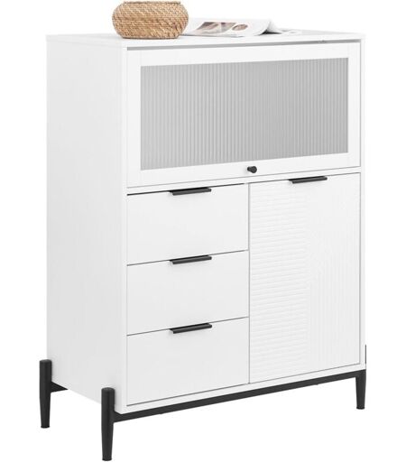 L'armoire de rangement multifonctionnelle peut résoudre la plupart des problèmes d’organisation de la maison ! Notre buffet FSB94-W est le meilleur choix ! La combinaison du blanc et du verre est élégante et classique. Il est parfait pour votre appartement ou votre maison, au couloir, à l'entrée ou dans la salle de séjour, etc. Le haut de l'armoire est optimal pour les choses décorations telles que les bougies, les albums photos, etc. Les petits accessoires peuvent être rangés dans 3 tiroirs. Il offre de l'espace pour des portefeuilles, des lunettes de soleil, des chapeaux, des parapluies, etc. Il y a un séparateur réglable derrière la porte inférieure pour ranger des objets plus volumineux tels que des boîtes à chaussures et des paniers de rangement. L'espace de rangement au dessus est doté d'une porte vitrée translucide. Vous pouvez y mettre de belles décorations ou des ustensiles couramment utilisés. Les pieds en métal rendent cette armoire plus stable. La hauteur du pied de 10 cm ...