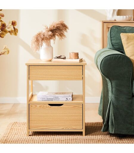 ?Design moderne et épuré?Les veines du bois clair créent une atmosphère proche de la nature, apportant chaleur et texture à votre intérieur, et rendant l'espace plus confortable et harmonieux.?Application polyvalente?Peut être utilisé comme table de chevet, idéale pour poser une lampe de chevet, des livres et des lunettes; aussi bien comme table d'appoint dans le salon, pour ranger télécommandes et magazines; ou dans le bureau pour organiser les fournitures et documents.Le tiroir supérieur offre un espace de rangement privé pour les objets personnels. Le tiroir inférieur dispose d'une poignée arrondie pour une prise en main agréable, assurant une ouverture et une fermeture fluides, et offrant un espace de rangement supplémentaire pour des objets volumineux.L'étagère ouverte centrale est idéale pour les livres, les téléphones ou les petits objets décoratifs.Fabriquée en panneaux de particules écologiques de classe E1, la surface lisse est résistante et facile à nettoyer. Dimensions : L45 cm x P37 cm x H55 cm, capacité de charge maximale de 41 kg.Livré à monter soi-même facilement avec la notice de montage illustrée et les pièces numérotées. Ce meuble peut être assemblée sans aucun d'effort. ...