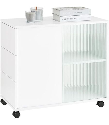 FBT141-W Bout de Canapé, Table d'appoint Roulante, Table Basse, Table à Café avec 3 Tiroir, pour Salon, Bureau, Chambre, Bois et Verre, Blanc - Sobuy