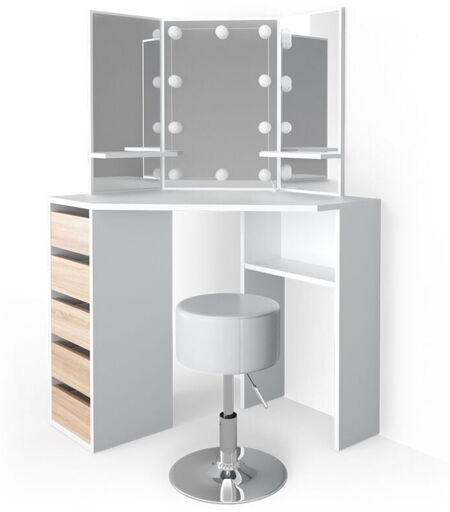 Coiffeuse Arielle, Blanc/Sonoma, 110 cm avec éclairage LED et tabouret, Vicco