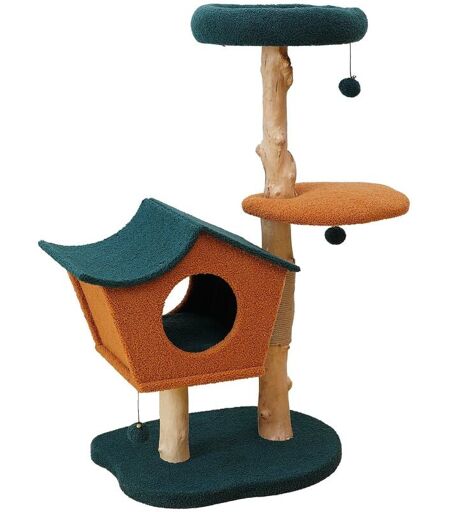 FUDAJO Arbre à chat - 114 cm de haut - design ludique - Meuble grattage félin - Couleur vert-orange - Bois de poirier - avec Tissu extra doux, maison,