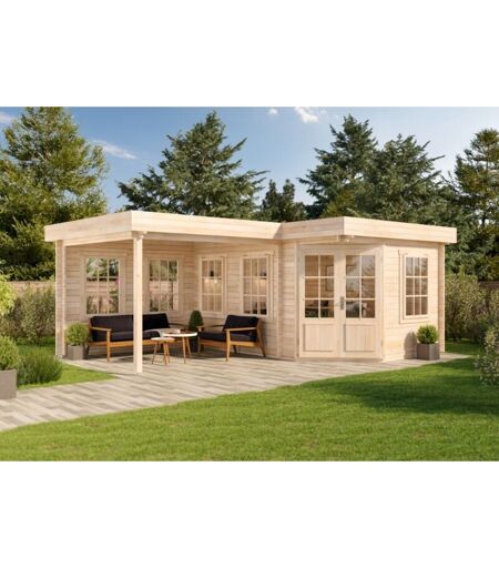 Description générale L'abri de jardin pentagonal Pepe est un espace convivial idéal pour profiter de vos après-midis d'été en famille ou entre amis. Grâce à sa conception lumineuse et spacieuse, cet abri est parfait pour une utilisation toute l'année, y compris au printemps et à l'automne. Spécifications techniques Dimensions extérieures : 442 x 302 cm + 300 cm (avancée de toit) Dimensions de la pièce principale : 422 x 282 cm Dimensions du toit latéral : 300 cm Hauteur des parois latérales : env. 216 cm Hauteur totale : env. 236 cm Débord de toit : env. 25 cm Superficie : env. 11,5 m² + 8,11 m² Volume de la pièce : env. 44,3 m³ Dimensions de la double porte : env. 134 x 190 cm Dimensions des 5 fenêtres ouvrantes : env. 86,5 x 122 cm Épaisseur des parois : 28 mm Matériau du toit : bois massif Compatibilité et accessoires Plancher non inclus (disponible en option) Solives non incluses Installation La construction de l'abri de jardin nécessite un espace dégagé et une surface plane. ...