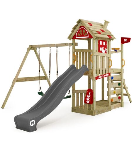 Wickey - Aire de jeux Portique bois FarmFlyer Tois avec balançoire et toboggan Maison enfant exterieur avec bac à sable, échelle d'escalade &