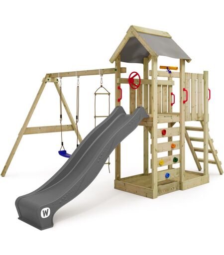 Wickey - tour de jeux en bois MultiFlyer avec balançoire et toboggan, tour d'escalade avec bac à sable, échelle et accessoires de jeu – anthracite