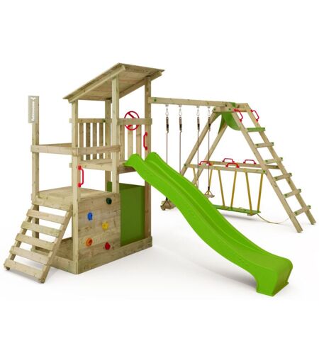 fatmoose Aire de jeux Portique bois FruityForest avec balançoire SurfSwing et toboggan Maison enfant exterieur avec bac à sable, échelle d'escalade &