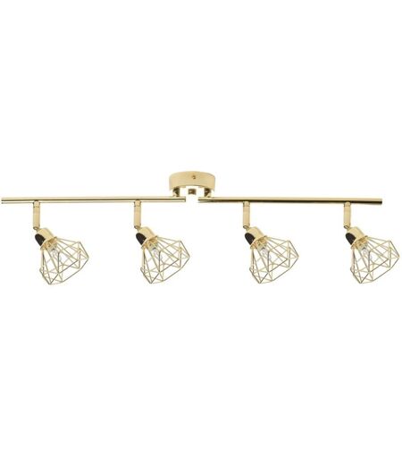Plafonnier doré 4 lampes de forme géométrique. Ce plafonnier doré doté de 4 abat-jours diamants réglables sera un accent idéal pour tout intérieur ultra-moderne ou d'inspiration industrielle. Le design en cage très tendance et le métal brillant complèteront à merveille chaque intérieur urbain. Ce plafonier peut aussi être utilisé comme applique murale, aussi bien dans le salon, le bureau ou dans l'entrée. Laissez-vous inspirer ! Détails: Type de produit: Plafonnier Couleur principale: Doré Type de matière: Métal Matière principale: Métal Matière de l`abat-jour: Métal Parties ajustables: Abat-jour Puissance: 20 W Finition: Brillant Code de protection IP: IP 20 Ampoules requises: 4 Tension: 230 V (50 Hz) Dimensions: Profondeur: 10 cm Largeur: 66 cm Hauteur: 14 cm Poids: 1 kg L`offre inclue: 1 x Lampe de plafond, Non inclus : ampoule Caractéristiques clés: Abat-jour réglable, Bras réglable, S'adapte à différents types d'intérieurs, Design moderne, Efficacité énergétique optimale, Facile ...
