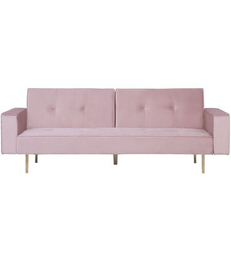 Canapé-lit clic clac en velours rose. Ce canapé-lit clic-clac sera l'élément phare de votre salon. Les accoudoirs confortables et les pieds en métal doré garantissent un confort optimal. Grâce à des lignes épurées et son revêtement en velours rose, ce canapé apportera une touche de modernité à votre séjour ou votre chambre et vous permettra de recevoir vos invités avec un maximum de confort, tout en étant très fonctionnel et facile à manipuler pour une utilisation quotidienne. Détails: Type de produit: Canapé 3 places Style: Glamour Couleur principale: Rose Type de matière: Tissu Matière principale: Velours Matière secondaire: Bois de pin Matière du rembourrage: Rembourrage en mousse Composition de la matière: 100% Polyester Style des accoudoirs: Droit Patins pour pieds: Oui Inclinable: Non Housse de coussin amovible: Non Construction du siège: Ressorts zigzag Densité de la mousse du siège: 50 kg/m3 Nombre de places assises: 3 Personnes Fonction couchage: Oui Mécanisme d`ouverture du canapé-lit: Clic-Clac Rangement: Non Dimensions: Dimensions des accoudoirs: 59 cm Profondeur: 81 cm Épaisseur du siège: 17 cm Hauteur du siège: 37 cm Largeur: 218 cm Hauteur: 80 cm Surface d`assise: 188x56 cm Surface de couchage: 188x107 cm Poids: 42 kg Charge admise par personne: 150 kg L`offre inclue: 1 x Canapé Caractéristiques clés: Facilement convertible en un canapé-lit, Style élégant, De haute qualité, Tissu soyeux et velouté, Entièrement rembourré sur tous les côtés Informations d`assemblage: À assembler entièrement. 20 - 40 min Informations supplémentaires: Gardez à l'esprit que le tissu en velours peut avoir un aspect un peu différent lorsqu'il est exposé à un éclairage différent - il a tendance à scintiller davantage à la lumière du jour et à paraître plus atténué dans un éclairage artificiel intérieur. En raison de la structure lisse à haute densité, la teinte du tissu en velours peut également varier lorsque vous passez à la main dans différentes directions et angles. Pour uniformiser la couleur et éliminer les bosses et les plis, le matériau doit être caressé avec une paume ouverte dans une direction, essuyé avec un chiffon humide ou un fer à repasser à la vapeur. Conseils de maintenance: Velours: 1.Nettoyez avec un shampooing sec ou une éponge humide et un nettoyant doux 2.Aspirez en utilisant l'embout approprié. Métal: 1.Nettoyez avec un chiffon et un détergent doux, essuyez bien ensuite 2.Pour éviter les rayures, n'utilisez pas de nettoyants abrasifs 3.Pour les éléments en cuivre ou chromés, utilisez un produit de polissage spécial. ...
