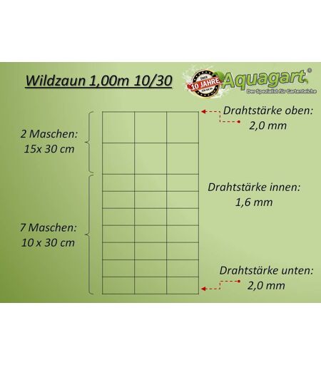Vous recevez ici un kit complet de clôture de protection contre la faune sauvage. Le kit comprend la clôture de protection contre la faune sauvage et les poteaux de clôture à profil en Z correspondants.Il contient les articles suivants : 100m clôture de protection contre la faune sauvage 100/10/30 et 30 poteaux de clôture à profil en Z de 1,5 m de long. La clôture de protection contre la faune sauvage : Vous ne recevez que des clôtures de qualité fabriquées en Europe et non des clôtures en fil de fer chinoises de qualité inférieure comme c'est souvent le cas !La clôture de protection contre la faune sauvage est un treillis métallique fait de fils d'acier épais et galvanisés dotés d?une haute résistance qui sont fermement reliés les uns aux autres par des n¿uds torsadés. C'est pourquoi les experts parlent également de grillage noué. Nous proposons la clôture dans des hauteurs comprises entre 1,0 m et 2,0 m, ainsi que de différentes tailles de mailles et épaisseurs de fil. Un grillage noué vous permet de clôturer de grandes surfaces rapidement, en toute sécurité et à peu de frais.Même si la clôture de protection contre la faune sauvage provient à l'origine de l'agriculture et de la sylviculture, elle est aujourd'hui utilisée dans une grande variété de projets de construction de clôtures. Vous serez surpris de l?utilisation polyvalente de cette clôture. Caractéristiques : Hauteur de clôture : 100 cmLongueur du rouleau : 50 m (par rouleau)Fils d'acier galvanisé à haute résistanceÉpaisseur du fil haut / bas : 2,0 mmÉpaisseur du fil vertical / horizontal : 1,6 mmType de n¿ud : n¿ud torsadéTailles de maille de bas en haut :7 mailles 10 cm x 30 cm2 mailles 15 cm x 30 cmLa largeur des mailles est de 30 cm en général Les poteaux de clôture à profil en Z : Vous ne recevez que des poteaux de clôture de qualité fabriqués en Allemagne, et non des poteaux de qualité inférieure et mal galvanisés provenant de Chine !Les poteaux de clôture à profil en Z sont utilisés pour mettre en place toutes sortes de grillages noués. Grâce à sa forme spéciale en Z, ce poteau de clôture est particulièrement stable et facile à enfoncer dans le sol.Des crochets de fixation qui servent à accrocher la clôture de protection contre la faune sauvage sont installés sur chaque poteau à profil en Z à une distance de 10 cm les uns des autres. Aucun autre matériel de fixation ou d'assemblage n'est nécessaire. De manière générale, les poteaux sont seulement enfoncés dans le sol. Vous pouvez utiliser notre protection contre les chocs ou nos pilons enfonce-piquet pour poteaux de clôture à profil en Z. Vous pouvez également bétonner les poteaux pour une plus grande stabilité. Caractéristiques : Hauteur de poteau : 1,50 mEspacement des crochets : 10 cmMatériau : bande en acier galvaniséÉpaisseur de matériau : 1,2 mmFacile à enfoncer dans le solConception en Z particulièrement stableConvient aux grillages noués de 0,8 m à 1,0 m de haut Nombre de colis : 4 ...