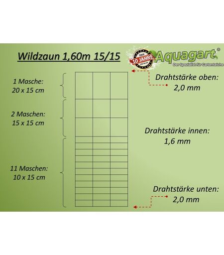 Vous ne recevez que des clôtures de qualité fabriquées en Europe et non des clôtures en fil de fer chinoises de qualité inférieure comme c'est souvent le cas !La clôture de jeu est un treillis métallique fait de fils d'acier galvanisés épais à haute résistance qui sont fermement reliés les uns aux autres par des n¿uds torsadés. C'est pourquoi les experts parlent également de grillage noué. Nous proposons la clôture dans des hauteurs comprises entre 1,0 m et 2,0 m, ainsi que de différentes tailles de mailles et épaisseurs de fil. Un grillage noué vous permet de clôturer de grandes surfaces rapidement, en toute sécurité et à peu de frais.Même si la clôture de protection contre la faune sauvage provient à l'origine de l'agriculture et de la sylviculture, elle est aujourd'hui utilisée dans une grande variété de projets de construction de clôtures. Vous serez surpris de l?utilisation polyvalente de cette clôture. Caractéristiques : Hauteur de clôture : 160 cmLongueur du rouleau : 50 m (par rouleau)Fils d'acier galvanisé à haute résistanceÉpaisseur du fil haut / bas : 2,0 mmÉpaisseur du fil vertical / horizontal : 1,6 mmType de n¿ud : n¿ud torsadéTailles de maille de bas en haut :11 mailles 10 cm x 15 cm2 mailles 15 cm x 15 cm1 maille 20 cm x 15 cmLa largeur des mailles est de 15 cm en généralPoids par rouleau : 25 kgNombre de colis : 2 ...