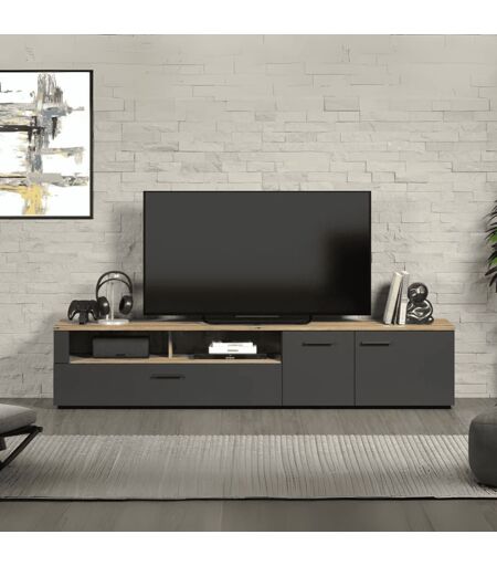 Caractéristiques produit : Grand meuble TV adapté pour un téléviseur jusqu'à 75'', ainsi que d'autres appareils électroniques tels que, box internet, lecteurs DVD, consoles de jeux, etc.. Meuble TV 2 portes, 2 niches, 1 abattant. Réalisé en panneaux de particules mélaminés chêne blond et gris anthracite mat. Labellisé PEFC certifiant que le bois issus des matériaux provient de forêts gérées de façon durable. Livré, démonté, sans décoration. Dimensions produit : Longueur 210 cm x Hauteur 43 cm x largeur 41 cm - Poids net : 50,15 kg. Dimensions colis : Colis n°1 : Longueur 143 cm x Hauteur 9 cm x Profondeur 44 cm - Poids brut : 21,7 kg. Colis n°2 : Longueur 223 cm x Hauteur 4,5 cm x Profondeur 47,5 cm - Poids brut : 21,2 kg. Poids brut total : 42,9 kg. ...