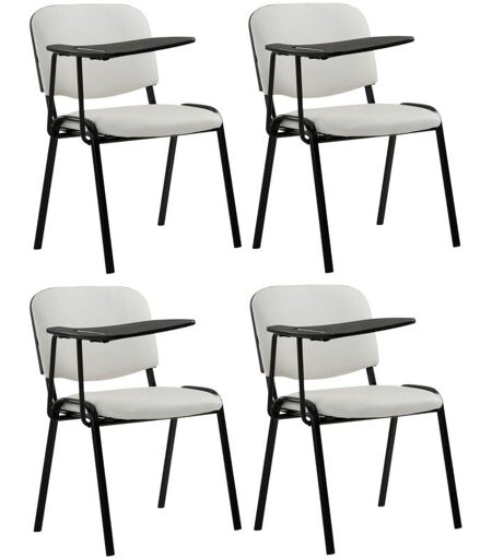 Lot de 4 Chaises de visiteur Ken avec tablette rabattable Cet ensemble de 4 chaises Ken en similicuir trouvera une place de choix au niveau d'une zone d'attente, salle de conférence ou dans une exposition ou salle de classe. La tablette rabattable est pratique et fonctionnelle. En plus de son design épuré, cette chaise se caractérise par le siège confortablement rembourré qui permet une utilisation de longue durée. La surface du siège est revêtue d'un similicuir de haute qualité aussi résistant que facile à entretenir. Le tout repose sur une structure et un piètement en métal noir mat. Composition du matériau: 100% Polyuréthane Dimensions (environ) Hauteur totale: 81 cm Largeur totale: 63 cm Profondeur totale: 71 cm Hauteur de l'assise: 46 cm Poids admis max: 120 kg Poids: 6 Kg Assise Matière: similicuir Assise et dossier confortablement rembourrés Particularités Petite table rabattable Construction stable & revêtement résistant Support Matière: métal noir mat Piétement à 4 pieds ...