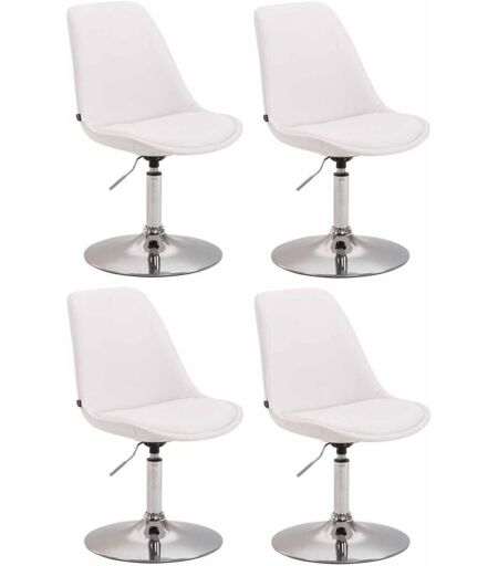 Lot de 4 Chaises de salle à manger Maverick en similicuir L'ensemble de 4 chaises de salle à manger Maverick offre une position d'assise confortable, notamment grâce au dossier haut mais également au rembourrage épais du siège. Le siège de ce modèle est, en effet, généreusement rembourré et revêtu d'un similicuir de haute qualité aussi résistant que facile à entretenir. Ce set de chaises design est réglable en hauteur et pivotant sur 360°, offrant, ainsi, une grande flexibilité et liberté de mouvement. Les réglages s'effectuent grâce à un levier sis au dessous du siège. Ce modèle repose sur un piétement robuste en métal aspect chromé, noir ou blanc mat (au choix). Le pied, en forme trompette, ajoute une touche de modernité à ces chaises. Composition du matériau: 100% Polyruéthane Dimensions (environ) Hauteur totale : 76 - 81 cm Largeur totale : 48 cm Profondeur totale : 57 cm Hauteur assise : 43 - 48 cm Surface assise (LxP) : 48 x 52 cm Hauteur du dossier : 32 cm Capacité de charge ...