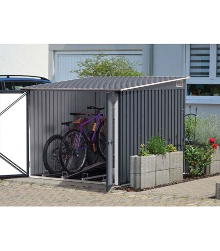 Les avantage du garage à vélo DURAMAX Le coffre à vélos en métal est une solution de rangement idéale pour stocker jusqu'à 4 vélos en toute sécurité. Grâce à ses compartiments spacieux et stables, vos vélos peuvent être rangés sans effort. Fabriqué en tôle d'acier galvanisée, ce coffre se distingue par sa durabilité exceptionnelle et son entretien minimal. Son revêtement en poudre spécialement conçu protège efficacement le métal contre la corrosion, même en cas de précipitations prolongées. Les grandes portes et les rails de guidage intégrés simplifient grandement le chargement et le déchargement des vélos. Avec son design classique et intemporel, ce coffre s'intègre parfaitement dans tout environnement extérieur. ✔ Pas d'entretien nécessaire ✔ Résistant aux intempéries ✔ Durable Fiche technique Garage à vélo DURAMAX 2x2 m Stabilité maximale : Structure renforcée par des profilés pour une stabilité optimale. Capacité généreuse : Permet de ranger jusqu'à 4 vélos de manière sécurisée. ...