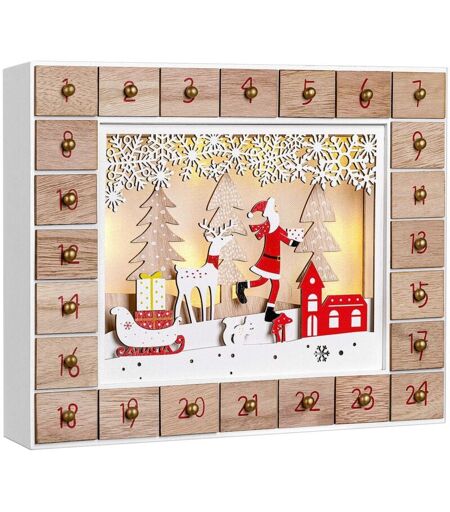 Faites briller chacun des 24 jours d’attente avant Noël ! Plongez dans la magie de l'attente de Noël avec le calendrier de l'Avent Spielwerk® ! Alliant charme traditionnel et élégance festive, ce calendrier en bois MDF séduit par ses 24 tiroirs décorés de chiffres rouges et de poignées dorées raffinées. Remplissez-le de petites douceurs, de jouets ou de mots tendres, et créez chaque jour une nouvelle surprise pleine d’émotion pour toute la famille. Plus qu'un simple calendrier, c'est un rituel enchanté qui fait revivre l'esprit authentique de Noël. Deux modèles sont disponibles : la forêt enneigée et le père Noël . Les différents plans de profondeur créent un effet 3D raffiné et confère à la scène une esthétique saisissante et poétique. Un interrupteur marche/arrêt se trouve à l'arrière. Son aspect naturel et son design discret en font le cadeau idéal pour les enfants et les adultes. Avantages du produit : Calendrier de l'Avent réutilisable 10 LED blanc chaud 24 petites portes ...