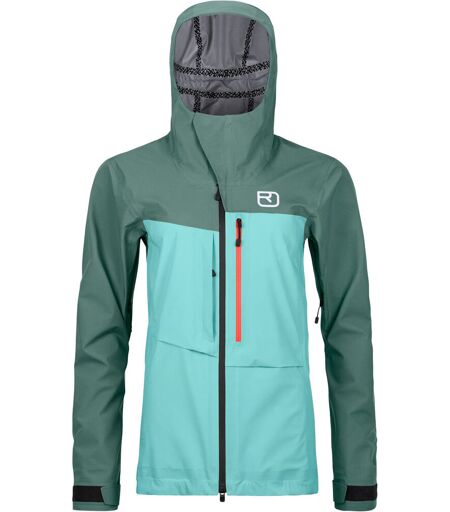 La 3L Ravine Shell Jacket Ice Waterfall de la marque Ortovox est une veste technique pour femme, idéale pour les sorties en freeride ou en ski de randonnée cet hiver.Cette veste est fabriquée avec une membrane DERMIZAX® NX coupe-vent et imperméable, doublée de laine de mérinos dans les zones du corps sensibles au froid, comme au niveau des reins. Les propriétés naturelles de cette matière garantissent une rétention optimale de la chaleur ainsi qu'une excellente respirabilité. De plus, la laine de mérinos neutralise naturellement les odeurs.La coupe ample de ce modèle vous offre une protection complète avec des ourlets réglables, une jupe pare-neige amovible, un col montant et une capuche compatible avec un casque. Les grandes poches avant vous permettent d'y glisser les objets importants tandis qu'une poche pour le smartphone en maille intégrée protège la batterie. Cette veste dispose également d'ouvertures de ventilation sous les bras.N'hésitez pas à compléter votre style avec le pantalon associé ! ...