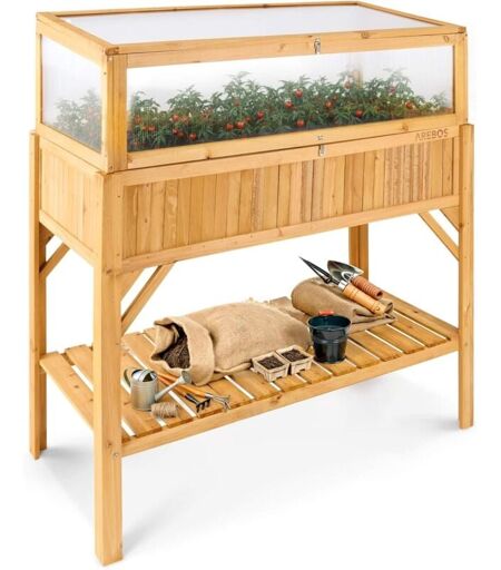 DESCRIPTION GÉNÉRALE La jardinière surélevée AREBOS est idéale pour le jardin, la terrasse et le balcon. Elle combine une grande surface de plantation avec une serre amovible. Fabriquée en bois de sapin et en polycarbonate, elle protège vos plantes des intempéries et prolonge la saison de culture. Sa hauteur ergonomique facilite le jardinage sans se pencher, et son design stable assure durabilité et protection contre les parasites. SPÉCIFICATIONS TECHNIQUES Charge maximale du bac à plantes : 100 kg Charge maximale de la surface de pose : 40 kg Dimensions totales : 119 x 53 x 124 cm Dimensions de la rehausse de la serre : 115 x 53 x 34 cm Dimensions du bac à plantes : 119 x 53 x 24 cm Dimensions intérieures du bac à plantes : 112,4 x 46,4 x 20,6 cm Dimensions de la surface de rangement : 116 x 50 x 33 cm Capacité : env. 191,4 L Matériau : Bois de sapin, tissu non tissé, plaque de polycarbonate Épaisseur de la plaque en PC : 0,3 mm Nombre de trous de drainage : 2 Épaisseur du bois : 1,7 ...