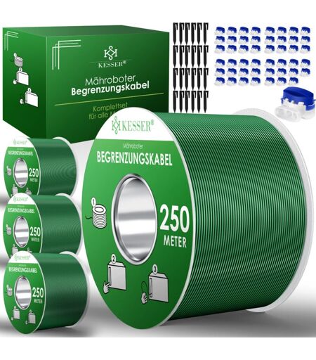 KESSER Câble de délimitation, y compris 12 connecteurs de câble avec coupe-fil intégré à chaque connecteur de câble, différentes tailles pour chaque jardin, parfaitement isolé et une conductivité idéale Plus beau et meilleur qu'un gazon anglais avec KESSER ! Notre câble périphérique est utilisé pour définir une zone prévue dans laquelle la tondeuse à gazon doit se déplacer et tondre la pelouse . La planification et l' installation sont simples et faciles à mettre en œuvre grâce à nos connecteurs de câbles et à nos clous à gazon . Dès que le robot de tonte atteint le câble posé , il est dévié ou arrêté , de sorte que seule la zone marquée par le câble de délimitation est tondue . Vous pouvez ainsi vous détendre sans avoir à surveiller constamment votre tondeuse à gazon . Grâce à la qualité et à la robustesse des matériaux utilisés , notre câble périphérique agit comme une clôture invisible pour votre robot de tonte . Avec un diamètre de seulement 2,7 mm pour la gaine et de 1,17 mm pour ...