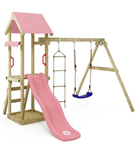 Wickey - tour de jeux en bois TinyCabin avec balançoire et toboggan, tour d'escalade avec bac à sable, échelle et accessoires de jeu – rose pastel