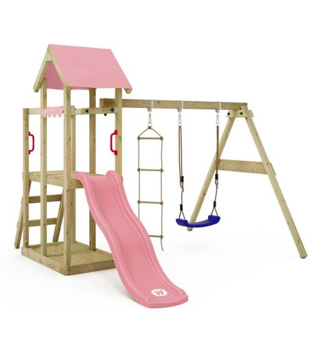 Wickey - tour de jeux en bois TinyPlace avec balançoire et toboggan, tour d'escalade avec bac à sable, échelle et accessoires de jeu – rose pastel