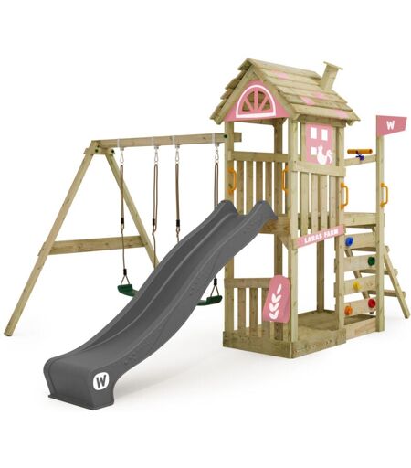 Wickey - Aire de jeux Portique bois FarmFlyer Tois avec balançoire et toboggan Maison enfant exterieur avec bac à sable, échelle d'escalade &