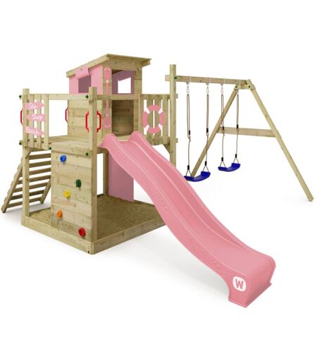 Wickey - tour de jeux en bois Smart Camp avec balançoire et toboggan, cabane avec bac à sable, échelle de corde et accessoires de jeu – rose pastel