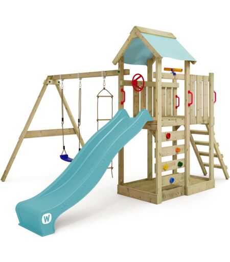 Wickey - Aire de jeux Portique bois MultiFlyer avec balançoire et toboggan Maison enfant exterieur avec bac à sable, échelle d'escalade & accessoires