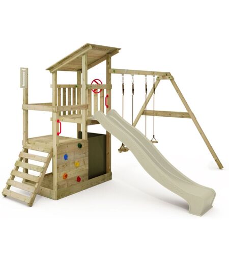 fatmoose Tour de jeux Portique d'escalade FruityForest avec balançoire et toboggan, tour d'escalade avec bac à sable, Échelle & accessoires de jeu – vert