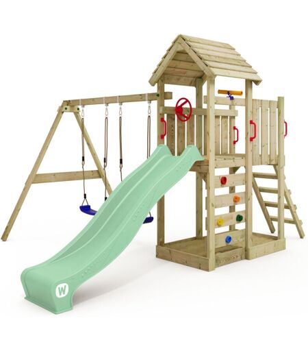 Wickey - Aire de jeux Portique bois MultiFlyer Toit en bois avec balançoire et toboggan Maison enfant exterieur avec bac à sable, échelle d'escalade