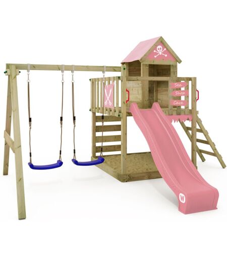 Wickey - tour de jeux en bois Smart Cave avec balançoire et toboggan, cabane avec bac à sable, échelle de corde et accessoires de jeu – rose pastel