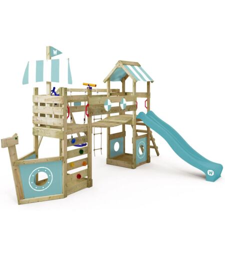Aire de jeux Wickey StormFlyer Ohé Capitaine ! Le petit marin commence de nouvelles aventures avec la tour de jeu Wickey StormFlyer et conquiert les mers du globe dans un monde de fantaisie. L’équipage peut se mettre au frais en grimpant au mur d’escalade et observer de tout près les sauts des dauphins. Pendant ce temps, le petit marin cherche les bateaux pirates à travers sa longue vue. Par mer agitée il maîtrise la barre à roue et atteint l’île de Flyer Island. Là, dans le bac à sable, il tombe sur une plage vierge et découvre un gigantesque trésor. Fly, Wickey, fly… ! Spécifications produits Série Wickey Flyer Bois massif imprégné en autoclave Qualité et sécurité contrôlées Plusieurs options de montage 10 ans de garantie* sur tous les éléments en bois Hauteur de plateforme 120 cm Dimensions des poteaux 9x4,5 cm Poutre du portique 9x9 cm Contenu de l'offre Toboggan double vague avec raccord pour l’eau 220 cm 1 Siège de balançoire avec corde ajustable Échelle de corde avec échelons ...