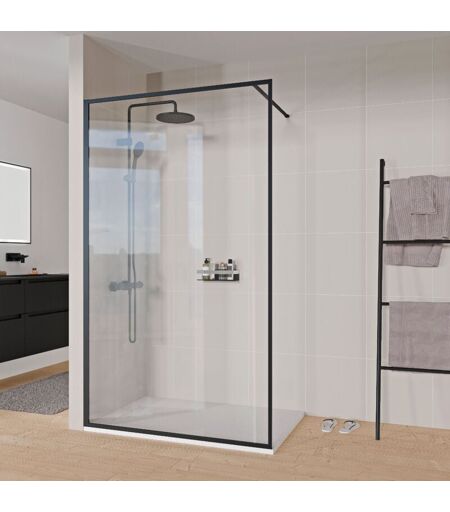 Paroi de douche à l'italienne FRAME - Verre clair de 8 mm avec revêtement nano - Profilé en aluminium noir mat 1 paroi en verre de largeur sélectionnée Incl. profilé murale Incl. barre de stabilisation Matériel de montage Instructions de montage Sans receveur de douche Sans éléments décoratifs Barre de stabilisation en aluminium de haute qualité Paroi de douche robuste avec un cadre noir élégant Sans vis visibles Revêtement nano permettant à l'eau de s'écouler Verre de sécurité ESG EN 12150-1 Installation avec receveur de douche ou à fleur du sol Profilé mural adapté à la fixation en surface et à fleur du mur Entrée extra-large Garantie de 5 ans Livraison Ce produit sera expédié par paquet jusqu'à bord de trottoir. La livraison prendra environ 5 à 7 jours ouvrés. N'oubliez pas de nous communiquer votre numéro de téléphone en passant commande. Avec notre paroi de douche à l'italienne FRAME , le design moderne est mis en uvre de manière fonctionnelle. Cette paroi de douche élégante se ...