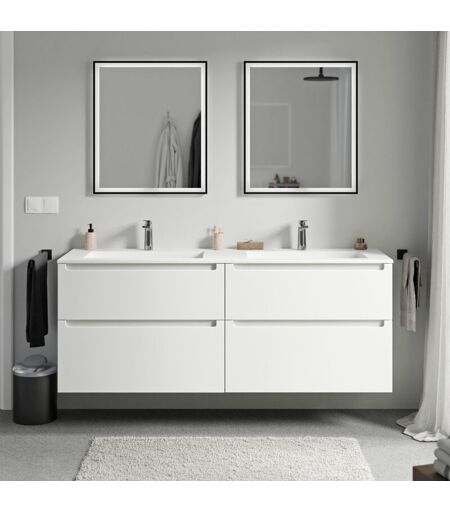 BERNSTEIN - Meuble double vasque suspendu salle de bain MDF Blanc mat, lavabos fonte minérale Blanc mat + trous robinet, tiroirs passe-main pivotants