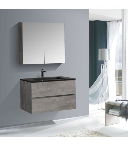 Bernstein Meuble vasque suspendu salle de bain mdf Aspect béton, lavabo Marbre Noir mat + trou robinet & 2 tiroirs - 85x52x52cm - edge 850 Béton, Noir mat