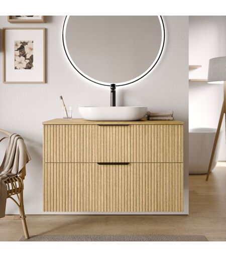 Bernstein - Meuble sous vasque lave-main suspendu mdf Chêne strié 100x46x62cm Plan lavabo Blanc mat + 2 tiroirs poignées métal Chrome - TIM100