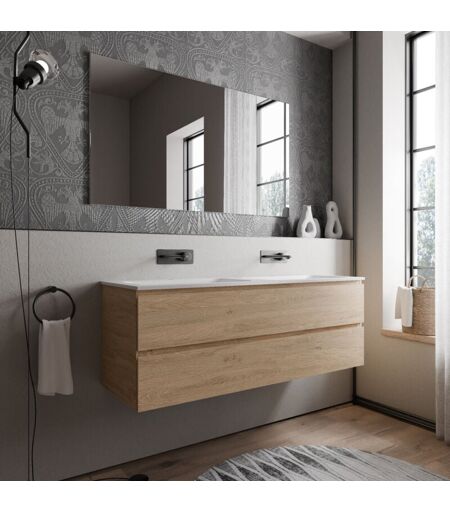 BERNSTEIN - Meuble double vasque suspendu MDF Chêne miel, 2 lavabos fonte Blanc mat sans trou robinet - 140x46x50cm - AVA BRUXELLES Chêne Miel doré,